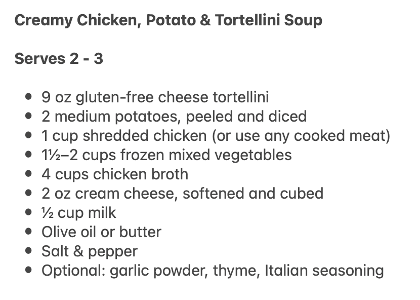 I also experimented with gluten-free tortellini soup – used this recipe: