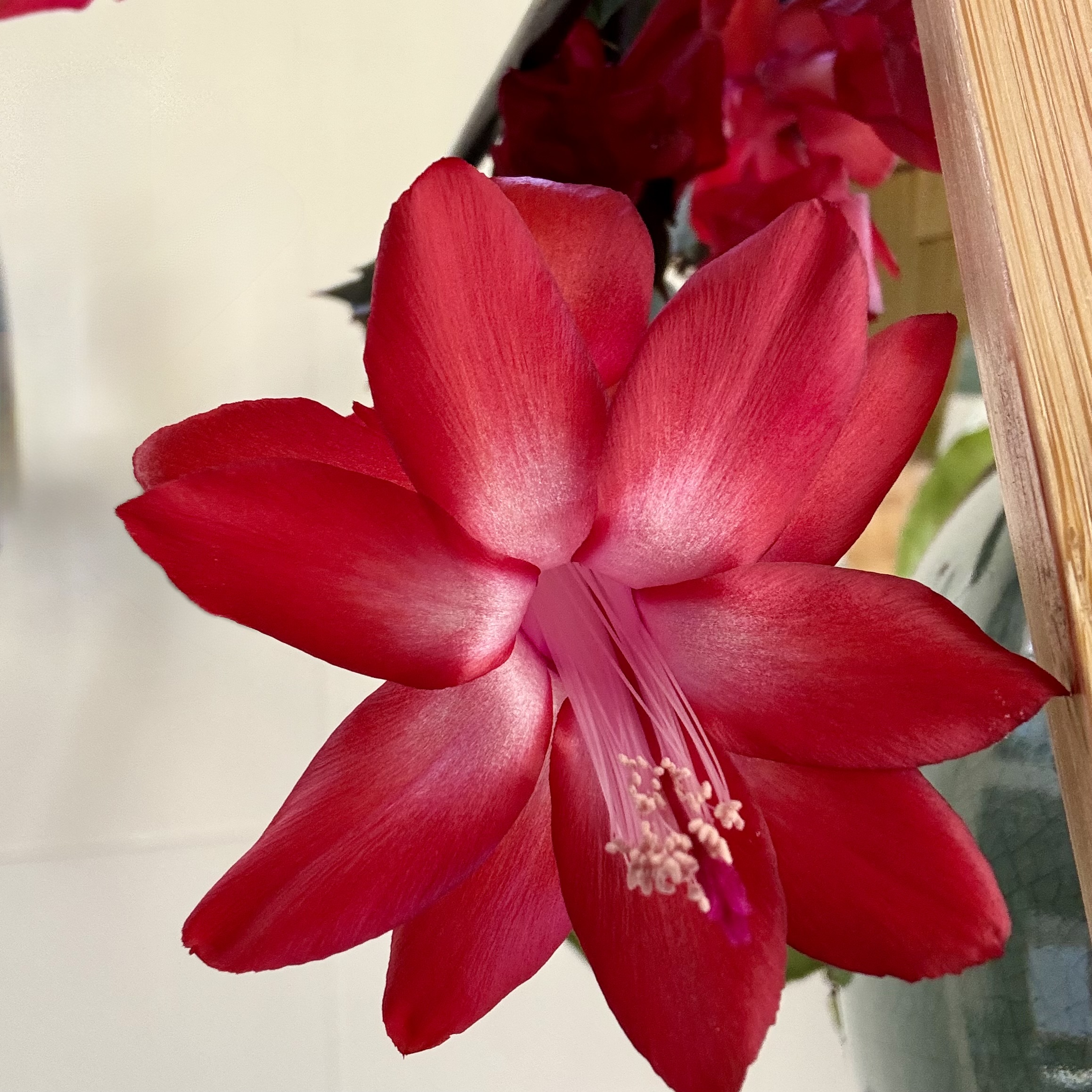 My holiday cactus is confused and blooming from every branch. The red flowers are so beautiful!